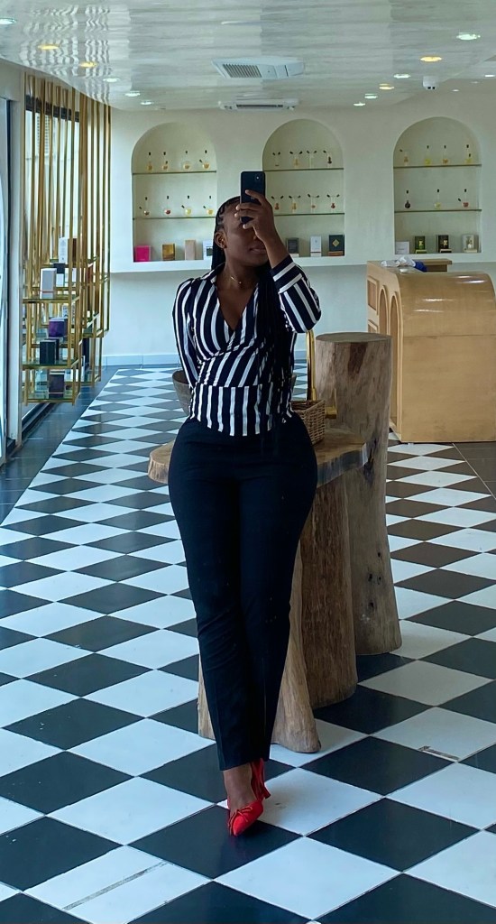 A white and black striped blouse styled with black pants and red heels for a sleek, modern look.